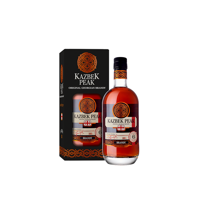 Brandy Kazbek Peak ma żywy, elegancki aromat słodkich nut miodu i wanilii, zrównoważony suszonymi śliwkami i karmelizowanymi orzechami laskowymi. W smaku wyczuwalne harmonijne smaki kory dębu i cynamonu. Pochodzi z regionu Kakheti o wspaniałych tradycjach winiarskich, a co najmniej sześciomiesięczne leżakowanie w dębowych beczkach nadaje mu szlachetny kolor bursztynu z refleksami ognistej miedzi.