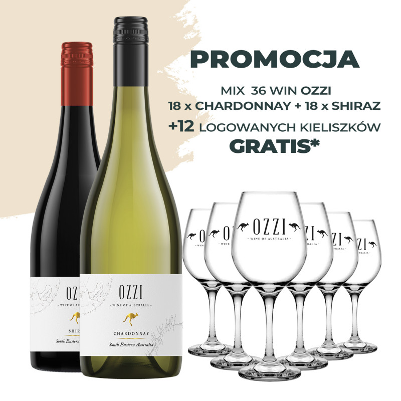 18 SZT OZZI CHARDONNAY 0,75L + 18 SZT OZZI SHIRAZ & CABERNET SAUVIGNON & MERLOT 0,75L+ ZESTAW 12 KIELISZKÓW OZZI 400ML / 12,5%/